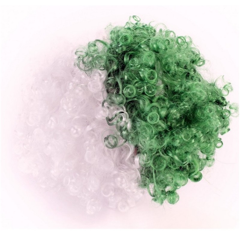 Zöld-fehér színű göndör paróka. Anyaga: műanyag