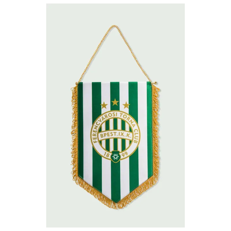 Zöld-fehér csíkos Ferencvárosi TC címerrel, arany rojtokkal és lánccal díszített futball cserezászló. Méret: 23x36 cm.