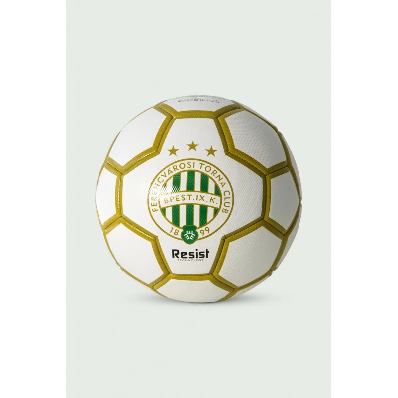 Szintetikus anyagból készült fehér, arany csíkokkal és FTC címerrel díszített labda. Méret: 5